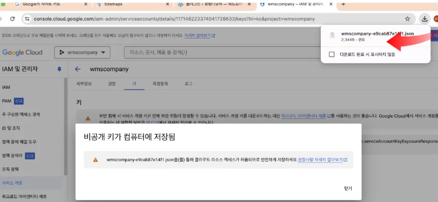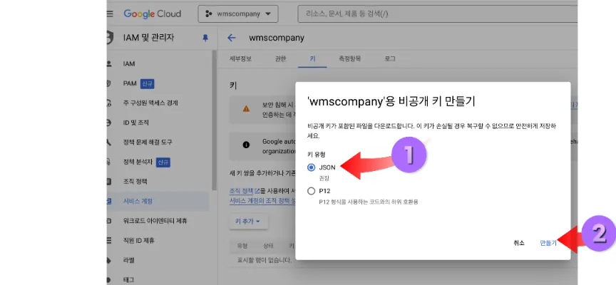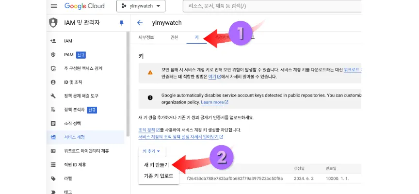 키 만들기 버튼 클릭해서 새키 만들기 JSON 클릭해서 만들기 해줍니다.