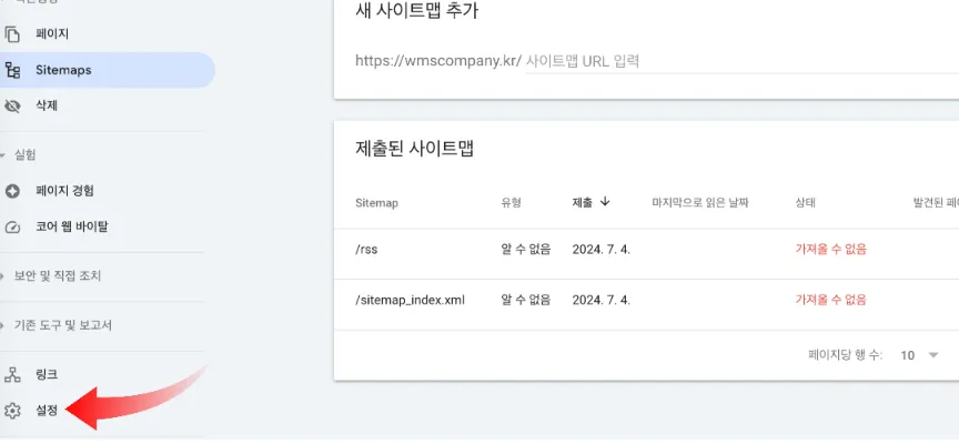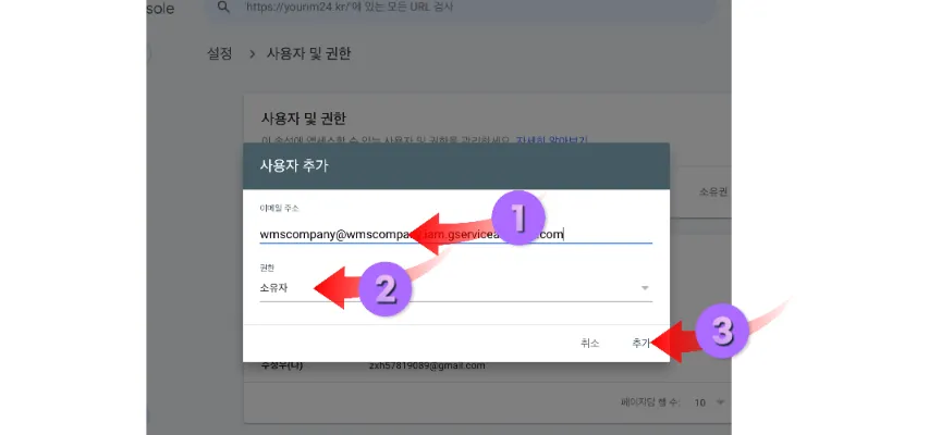 다음 구글 서치콘솔 화면에서 설정 사용자 추가에서