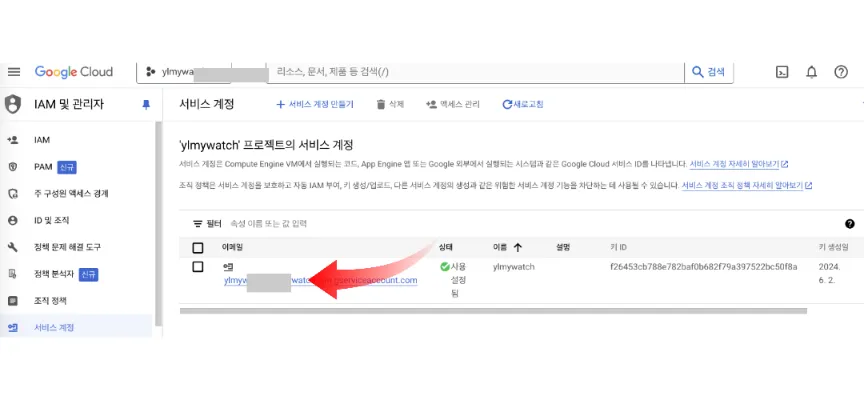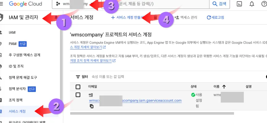 IAM 및 관리자에서 서비스 계정 클릭하고 새로 만든 프로젝트 꼭 클릭하셔야 합니다. 다음 서비스 계정 만들기 해서 이름은 또 도메인 이름으로 하면 기억하기 쉽지요. 이메일이 생성되면 꼭 잘 복사해서 메모장에 잘 보관해야 합니다. 그러고 다른 버튼 클릭하지 말고 완료 버튼 클릭해야 합니다.