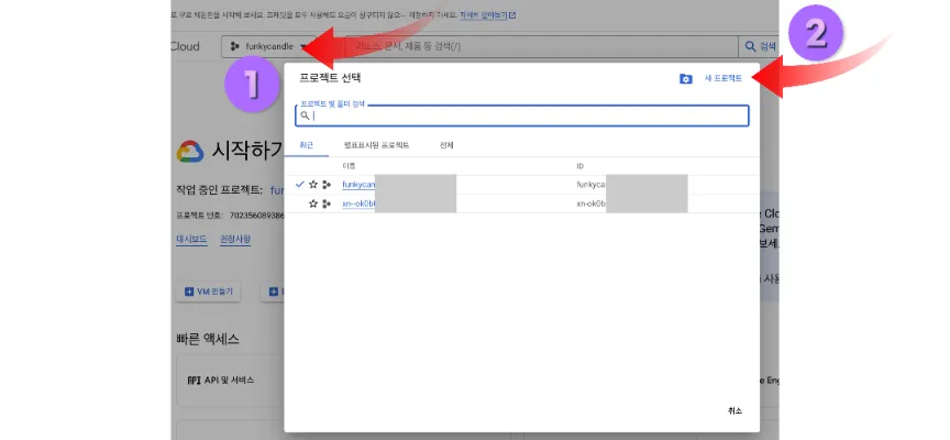 클릭해서 순서대로 따라 하시면 됩니다. 새 프로젝트에서 이름은 도메인 이름으로 aaa.com이라면 aaa 이름으로 새 프로젝트 만들기 하면 다음에 찾기도 쉽고 좋습니다. 점 같은 건 입력하면 만들기가 안되고 있어요.