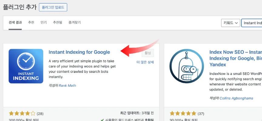 먼저 워드프레스 관리자에서 플러그인 설치 합니다. 플러그인 새로 추가해서 Instant Indexing 설치 및 활성화해줍니다. 아래그림 보면서 따라 하시면 큰 부담이 없을 것입니다.