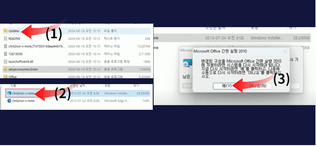 다운로드가 시작됩니다. 오피스 설치 중 - 설치완료 되면 설치 프로그램이 자동으로 종료됩니다. 종료되면 업데이트 폴더로 이동해 주세요 1번 클릭하고 2번 화면 보고 클릭해 주세요. 업데이트 종료 메시지 화면에서 확인 클릭해 주고 간편 실행 적용하려면 컴퓨터를 다시 시작합니다. 확인해주세요.